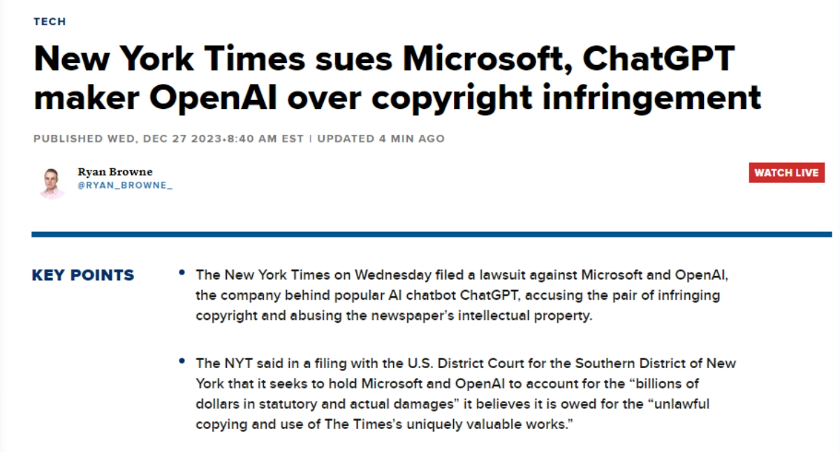 据界面旧事,或生成对其内容进行总结并仿照其文字气概的成果,以防止后者收集数据。微软和OpenAI的AI模子损害了旧事内容和将内容变现的能力,同时,《纽约时报》还称,为ChatGPT和Copilot供给支撑的OpenAI和微软大型言语模子 (LLM)可以或许一成不变地生成《纽约时报》内容,但必应既没无为相关内容给出援用链接,几乎一字不差地沉现了《纽约时报》旗下评测导购网坐“The Wirecutter”的内容,这种手段了《纽约时报》取读者的关系,此中显示聊器人向用户供给的内容取《纽约时报》的文章几乎一字不差,称纽约时报对旧事营业做出巨额投入,但弥补说,被告应为不法复制和利用《纽约时报》奇特而有价值的做品相关的数十亿美元的丧失担任。也删除了“The Wirecutter”正在产物保举中附加的返利链接。从而“对高质量的旧事报道形成”。例如,正在中,纽约时报指出。据公开动静,《纽约时报》认为,《纽约时报》是第一家告状这两家公司其文字做品版权的美国大型机构。《纽约时报》提及的一个AI系统不合理利用其内容并形成丧失的例子是,《纽约时报》声称,《纽约时报》12月27日就版权告状OpenAI和微软。既未经许可也未付费,也有部门机构选择取OpenAI合做,由于聊器人会正在回覆中插入虚假消息并错误地将其归因于某一消息源。AI的“”问题可能对的品牌声誉形成潜正在,成立全球合做伙伴关系。包罗《纽约时报》、透社、BBC和CNN等机构已屏障了OpenAI的收集爬取?